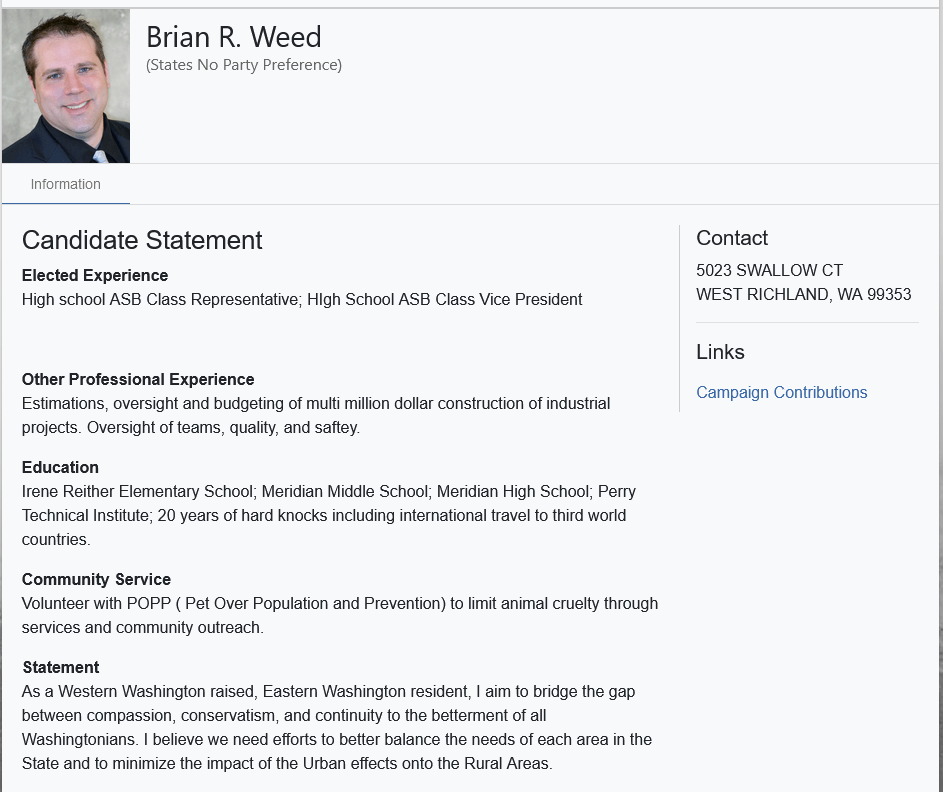Overall impression: Really? You’re listing your high school class president experience? He does look like he did just graduate high school. But then: “Estimations, oversight and budgeting of multi million dollar construction of industrial projects. Oversight of teams, quality, and saftey.” Misspelling “safety”. Hm. Then he lists his elementary, middle, and high school? LOL. Dude, just like your highest degree. “20 years of hard knocks including international travel to third world countries.” Groan. While the rest of his statement is acceptable, the first half lost me. It’s just too silly.