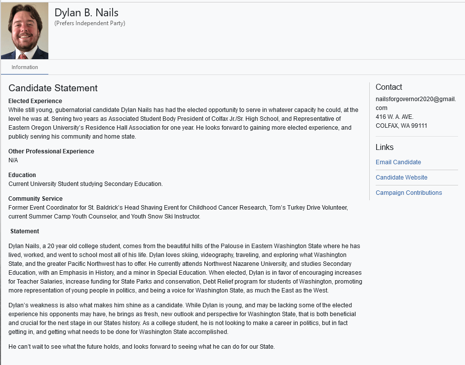 Overall impression: 20 years old with no professional experience and still in college. “Dylan’s weakness is also what makes him shine as a candidate. While Dylan is young, and may be lacking some of the elected experience his opponents may have, he brings as fresh, new outlook and perspective for Washington State, that is both beneficial and crucial for the next stage in our States history. As a college student, he is not looking to make a career in politics, but in fact getting in, and getting what needs to be done for Washington State accomplished. He can’t wait to see what the future holds, and looks forward to seeing what he can do for our State.” I feel like a bitter old man saying this, but this kid isn’t ready yet. He’s too optimistic. Finish college, and or work for a few years outside of politics. The world is a harsh, cruel place. If he’s still optimistic after that, I’ll believe him. Good luck kid.