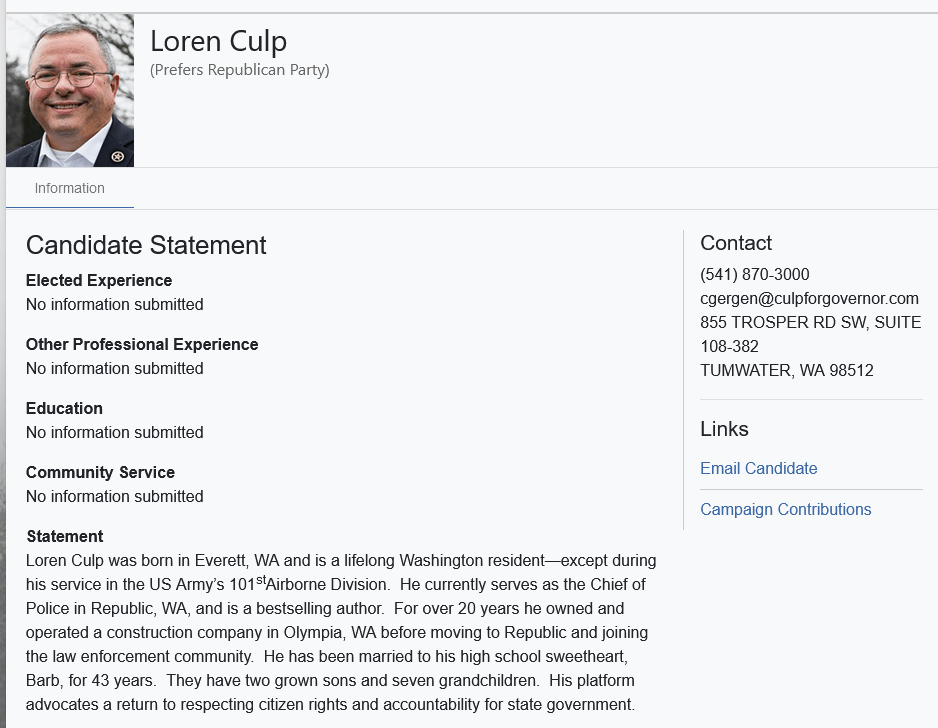 I have a hard time believing him when he ends his statement with this: “His platform advocates a return to respecting citizen rights and accountability for state government.” What about our Washington citizen rights to vote laws in by initiative? What about accountability for your actions as a representative of the state government as Police Chief? You know what…