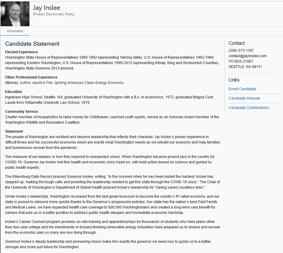 Candidate #30: Jay Inlsee. Democratic Party. Current Governor of WA.