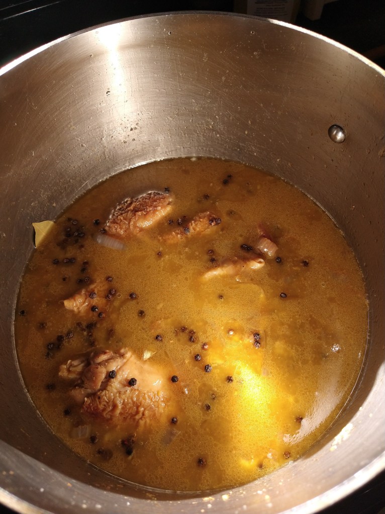 The pot with everything in it. The whole black peppercorns mellow out after simmering in this recipe.
