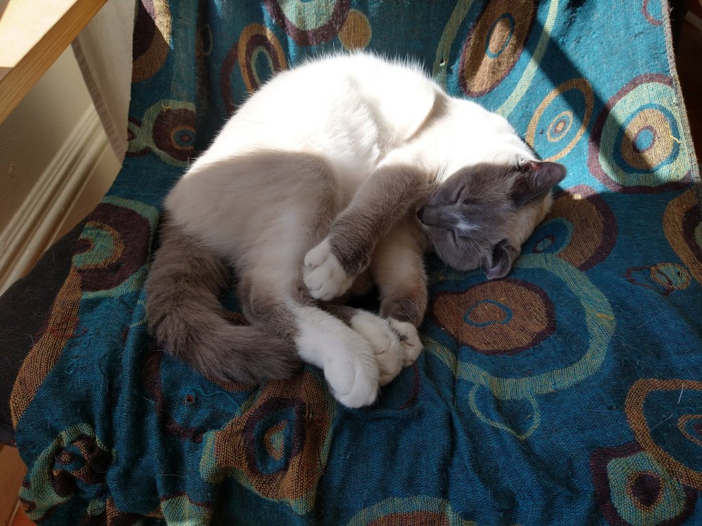 Coco coming into my room, to my feet, looking up at me, dashing up me like a ramp, and standing on me to snuggle. Pressing against my face for lovies.