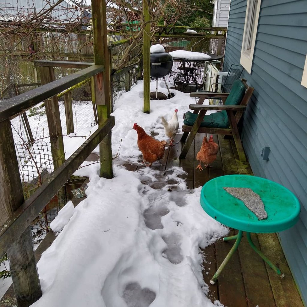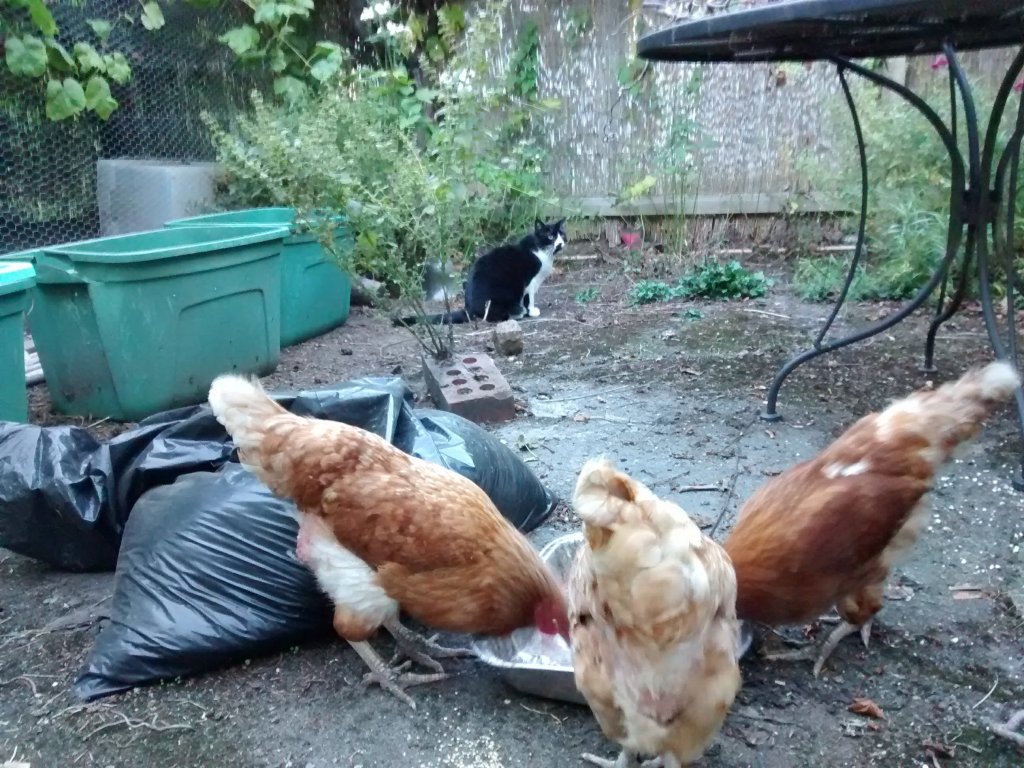 Betty would hang out with us outside whenever my mother or I sat outside on the deck. Or the chickens would follow me inside as I took out the trash and recycling. Chickens are excellent companions. Rest in peace, Betty.